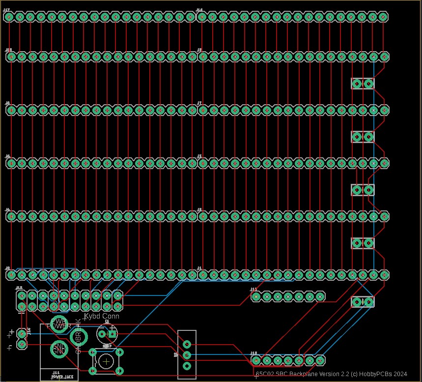 A simple backplane PCB allowing up to 5 PCBs to share the Data and Address lines of the HobbyPCB 65C02 SBC. It has the same 36-pin pinout as the SBC, Floppy IF board, and VDU board, so all boards connect easily to each other.